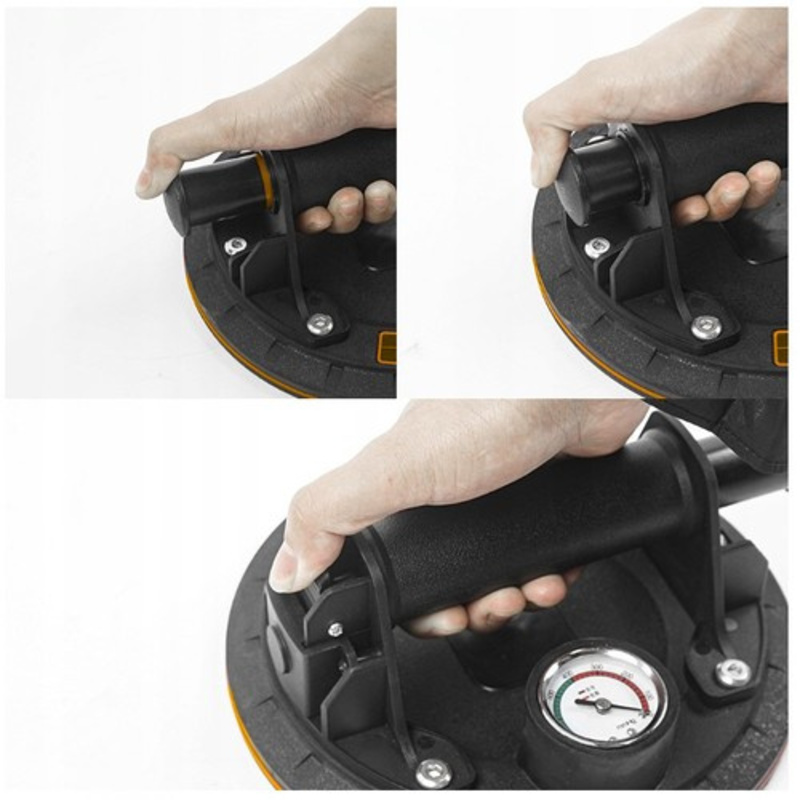 Cu ajutorul pompei integrate, se creează rapid un vid puternic care fixează ventuza pe suprafață. După finalizarea lucrării, supapa de eliberare a presiunii permite detașarea rapidă și sigură, fără a lăsa urme pe materialul manipulat.
